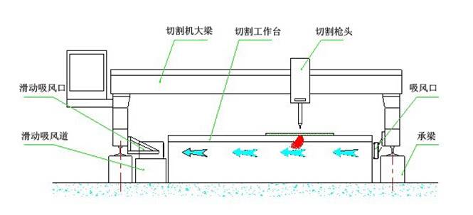 側吸式煙塵凈化系統采用吸風口固定在切割機龍門架上,吸風口與吸風道之間通過密封皮帶密封,吸風口可隨龍門架在吸風道上來回移動吸風,將切割的粉塵吸除。